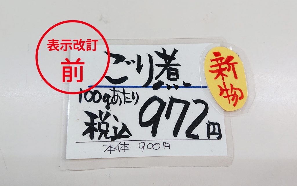 店頭商品値札を今までは税込価格を大きく表示してましたが、このたびお食事処をするにあたり値札表示を変更いたします。